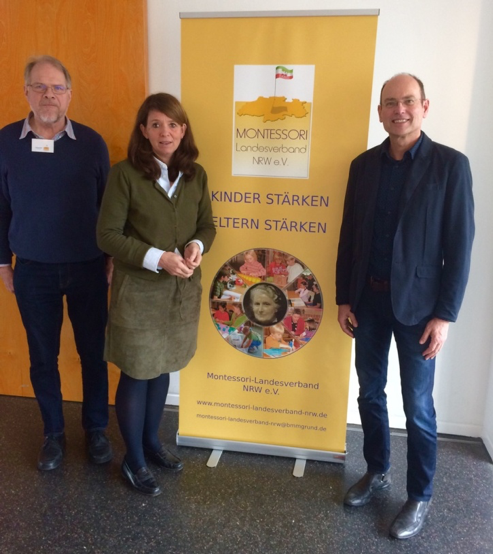 Am Mittwoch trafen sich rund 50 Montessori-Pädagogen aus ganz NRW zum Montessori-Tag des Montessori-Landesverbandes NRW. Morgens fing es mit Hospitationen in Montessori-KiTas und Montessori-Schulen im Münsterland an. Ab Mittag gab es die Fortsetzung mit Impulsvortrag und Arbeitskreisen zum Thema „Förderung der Handschrift“ in der Integrativen Montessori-Gesamtschule Borken. Dort hatten Schülerinnen und Schüler sich auf die Bewirtung der Gäste eingestellt und servierten mit Unterstützung Ihrer Lehrerinnen und Lehrer einen Imbiss, Kaffee und Kuchen. Der Schulleiter Herr Knors hatte für den Tag alles auf den Montessori-Tag eingestellt. So konnten sich rund 50 Erzieherinnen, Lehrerinnen und Lehrer gut umsorgt auf das vielschichtige Thema des Erwerbs einer gut lesbaren Handschrift einlassen. Mit ausgesuchtem Montessori-Material gab es am Nachmittag mehrere Arbeitskreise, in denen der Focus auf die sensible Zeit des Schriftspracherwerbs gelenkt wurde. Vorher hatte Frau Ruth Püttmann, Grundschullehrerin und Vorsitzende des Montessori-Landesverbandes, die Teilnehmer begrüßt. Herr Matthias Wüstefeld, Linkshänder-Berater aus Münster, hielt danach den Impulsvortrag zum Aufbau einer handschriftlichen Kompetenz. Vor allem die fachkundige Begleitung von Linkshändern in der Grundschule lag ihm dabei am Herzen, aber auch die Verbindung von Druckbuchstaben und einer späteren flüssigen Handschrift als Voraussetzung für viele Prüfungen auf dem Weg zur Berufsfindung. Der Montessori-Tag findet alle 2 – 3 Jahre im Münsterland oder im Rheinland statt und wendet sich mit aktuellen pädagogischen Themen an ErzieherInnen und LehrerInnen in NRW.